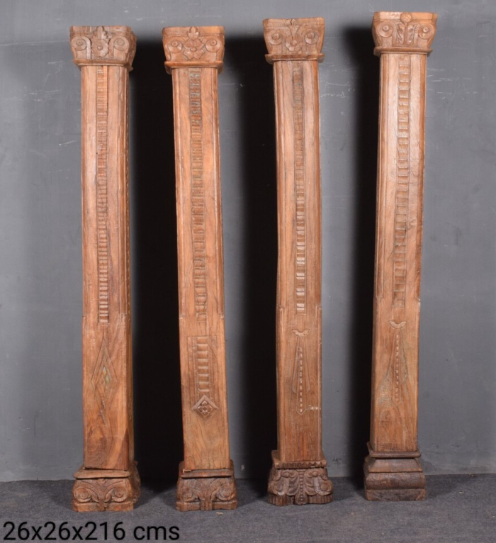 These are likely antique or handcrafted wooden architectural columns used in traditional structures or as decorative interior elements. The designs suggest they may be of South Asian or Southeast Asian origin, often found in heritage homes, temples, or vintage-style interiors.